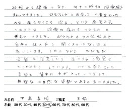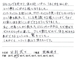 約3ヶ月間の肩と腕を中心とした施術で、激しい激痛から開放され、体が大変楽になりました。ありがとうございました。以後様子を見てまたお願いすることがあるかと思います。